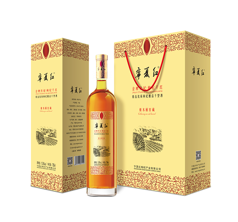 采用百分百寧夏中寧枸杞,為保證果實清新度,均在涼爽的早晨采收,枸杞經過2次清洗,進行榨汁,采取低溫發酵,恒溫陳釀,再經法國橡木桶窖藏,每種產品按照原料成分和不同的陳釀時間區分。經過橡木桶窖藏后,金黃色的酒體,更加晶瑩剔透、有光澤;除了枸杞果香外,增加了橡木香,更加復雜、和諧;酒體既保留了清香典雅的枸杞果香,又富有厚重的單寧口感,締造了具有自身風格與眾不同的酒類新貴。優秀釀酒大師精心釀造而成,更營養,更健康, 口感更好,品質更有保證!