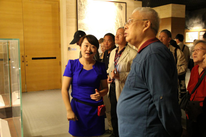 陳毅之子陳昊蘇(右一)認真的聽展館講解員介紹寧夏賀蘭山巖畫中蘊藏的西夏文明